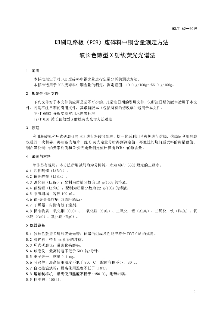 HS/T 62-2019 印刷电路板(PCB)废碎料中铜含量测定方法——波长色散型X 射线荧光光谱法