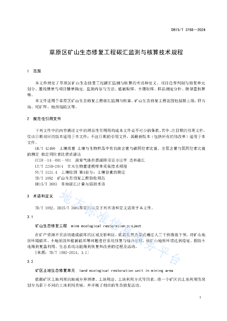 DB15/T 3768-2024 草原区矿山生态修复工程碳汇监测与核算技术规程