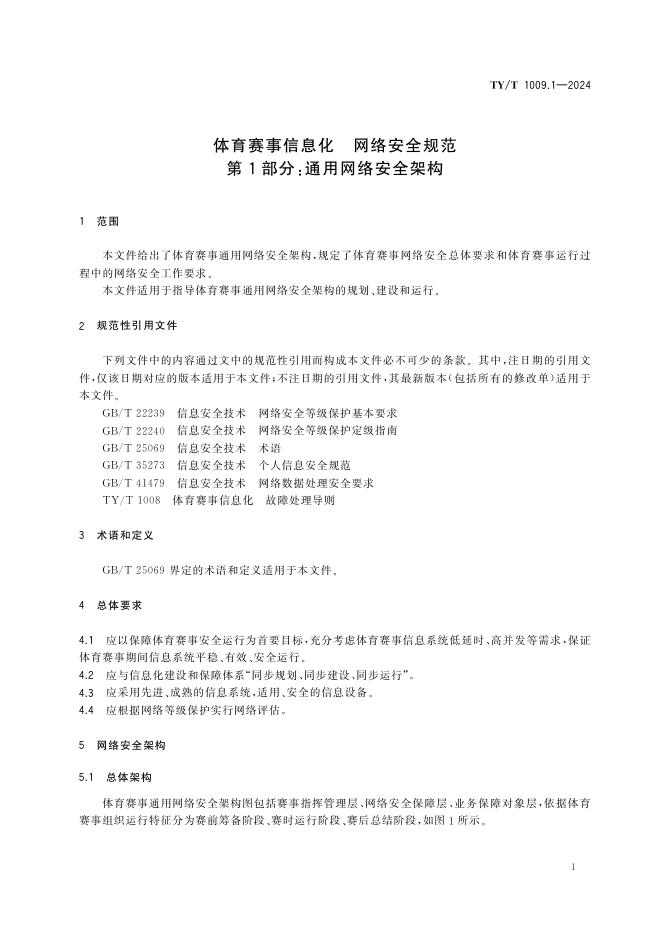 TY/T 1009.1-2024 体育赛事信息化 网络安全规范 第1部分:通用网络安全架构