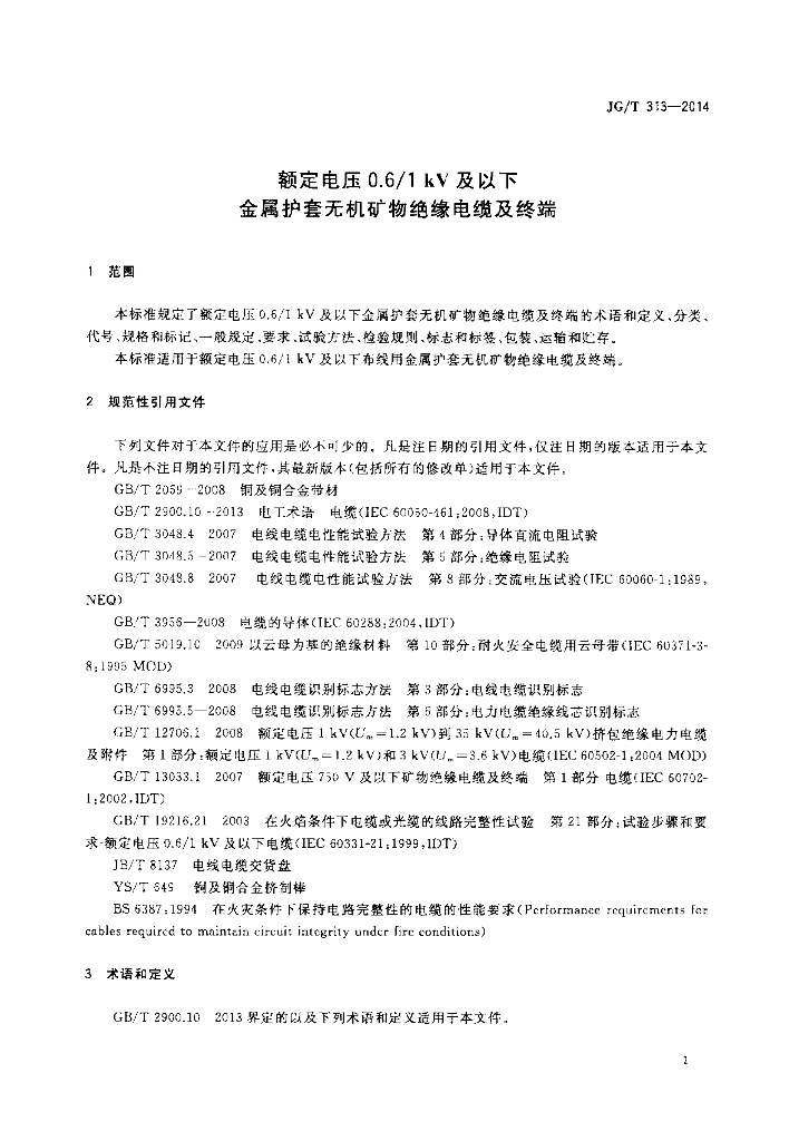 JG/T 313-2014 额定电压0.6/1kV及以下金属护套无机矿物绝缘电缆及终端