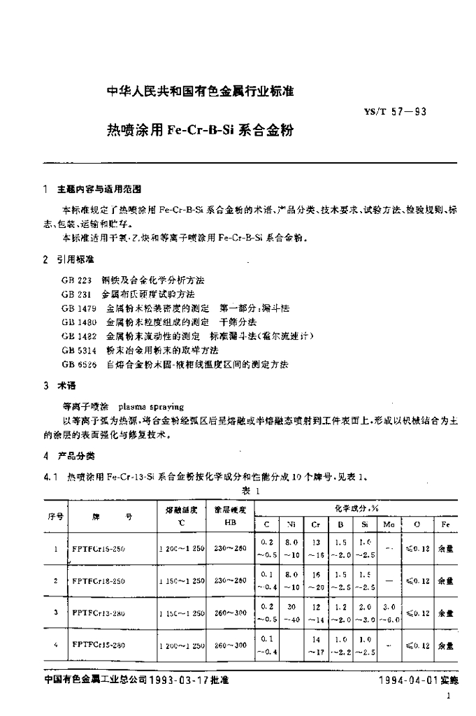 YS/T 57-1993 热喷涂用Fe-Cr-B-Si系合金粉