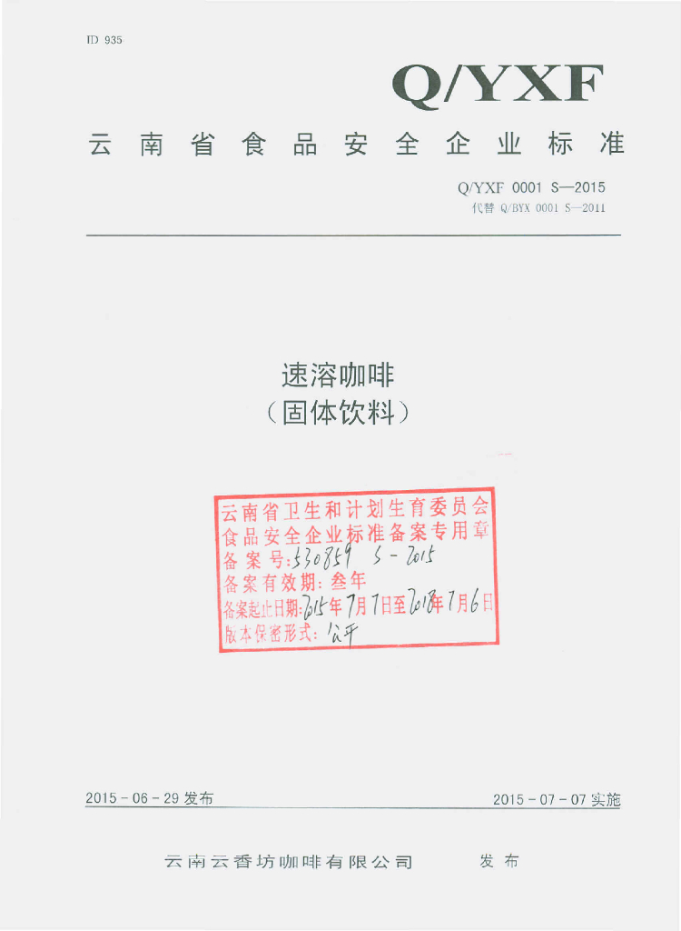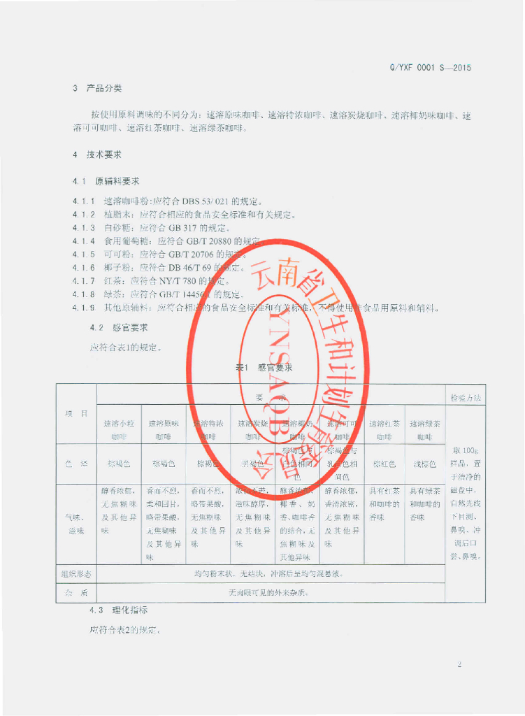 Q/YXF 0001S-2015 云南云香坊咖啡有限公司 速溶咖啡(固体饮料)