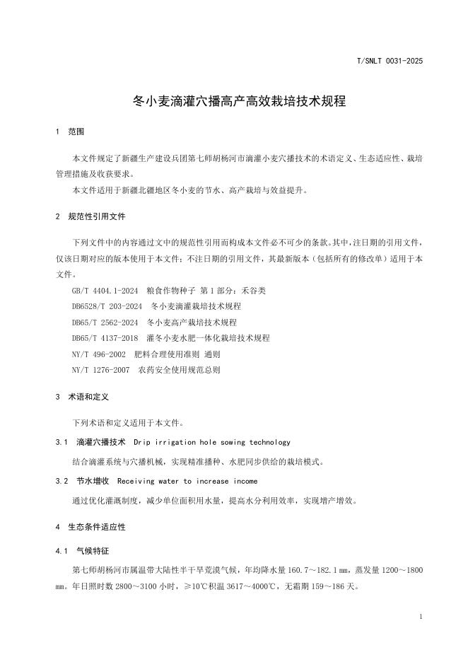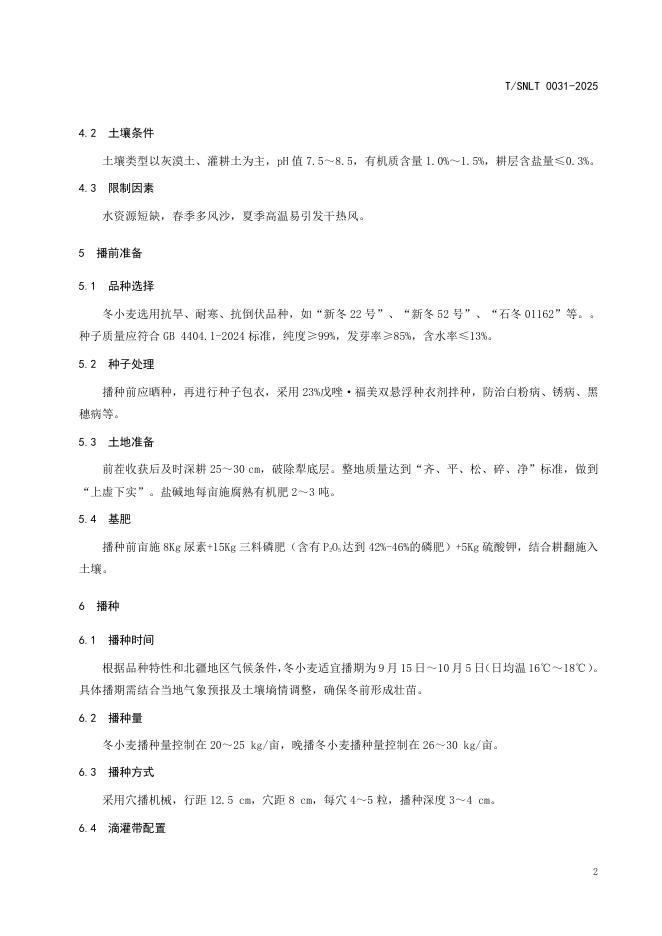 T/SNLT 0031-2025 冬小麦滴灌穴播高产高效栽培技术规程