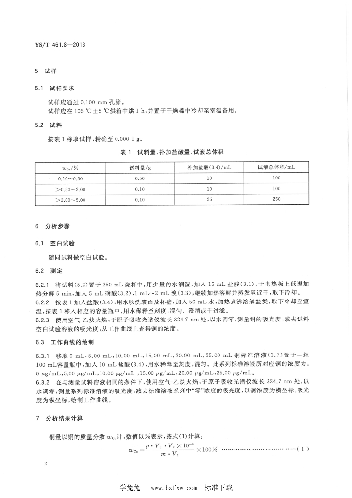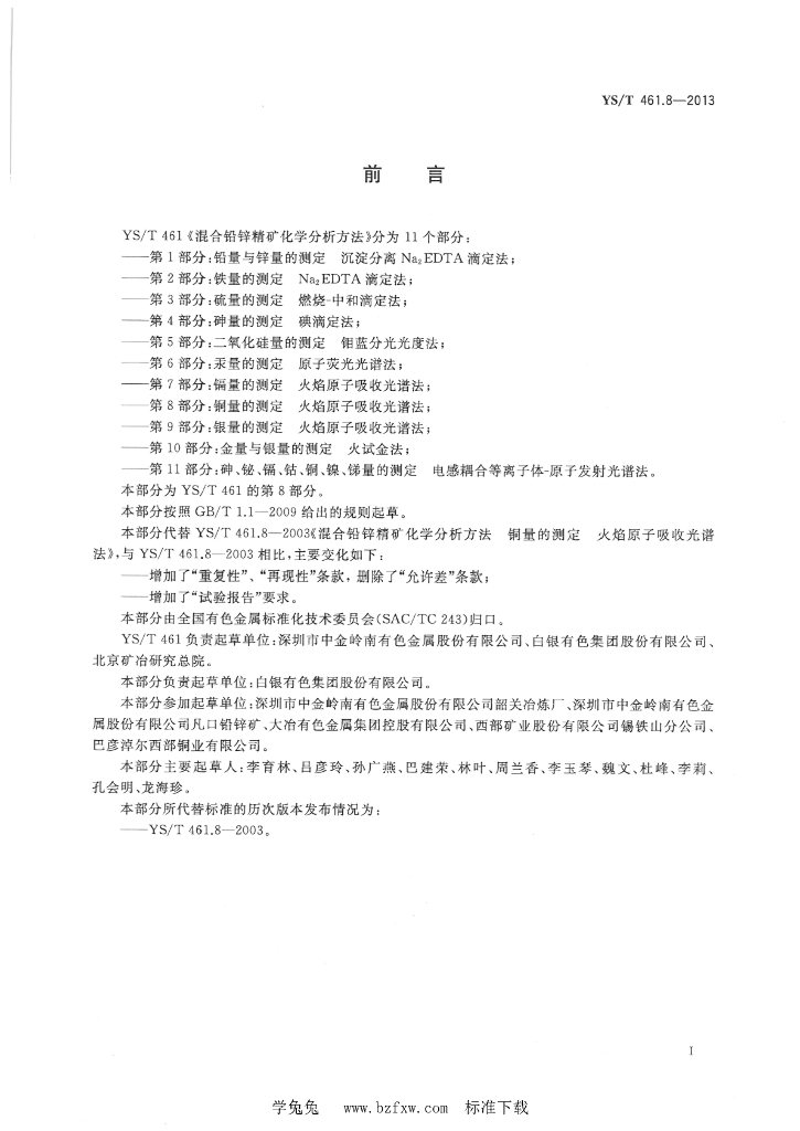 YS/T 461.8-2013 混合铅锌精矿化学分析方法 第8部分:铜量的测定 火焰原子吸收光谱法