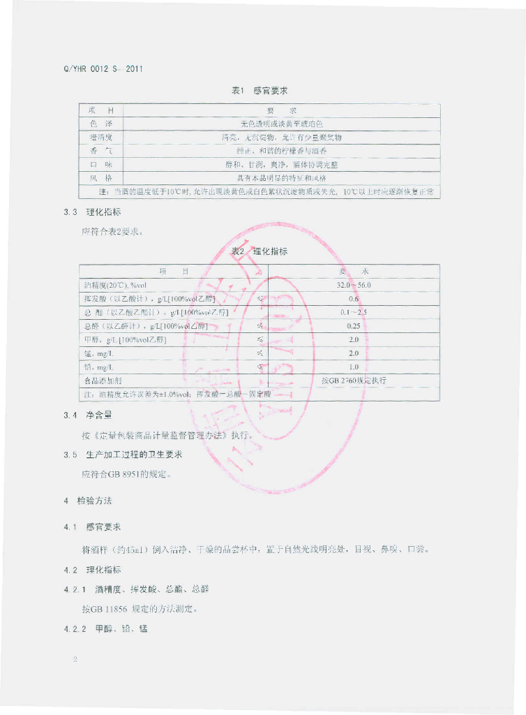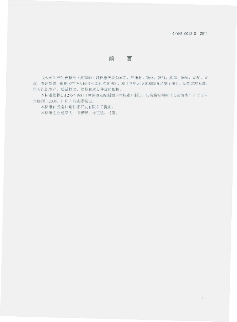 Q/YHR 0012S-2011 柠檬酒(蒸馏酒)