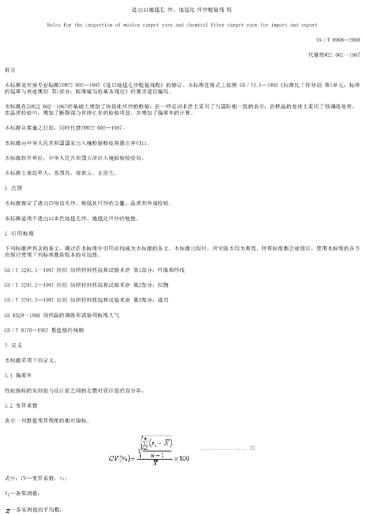 SN/T 0908-2000 进出口地毯毛纱、地毯化纤纱检验规程