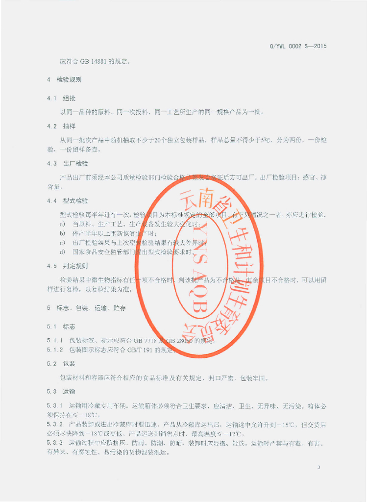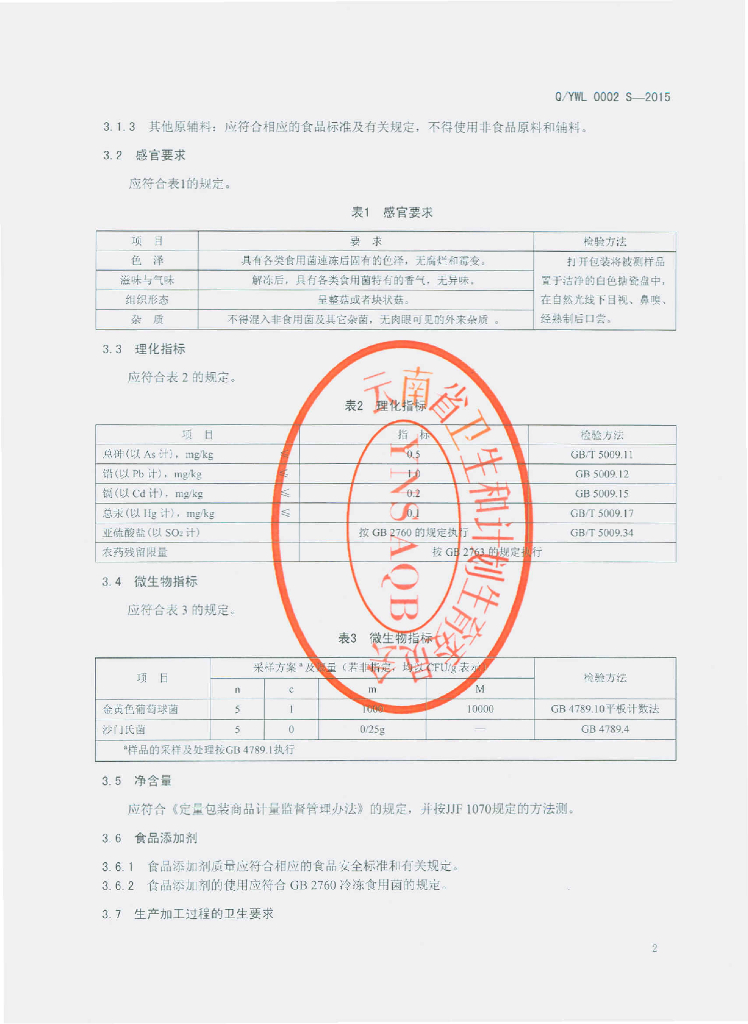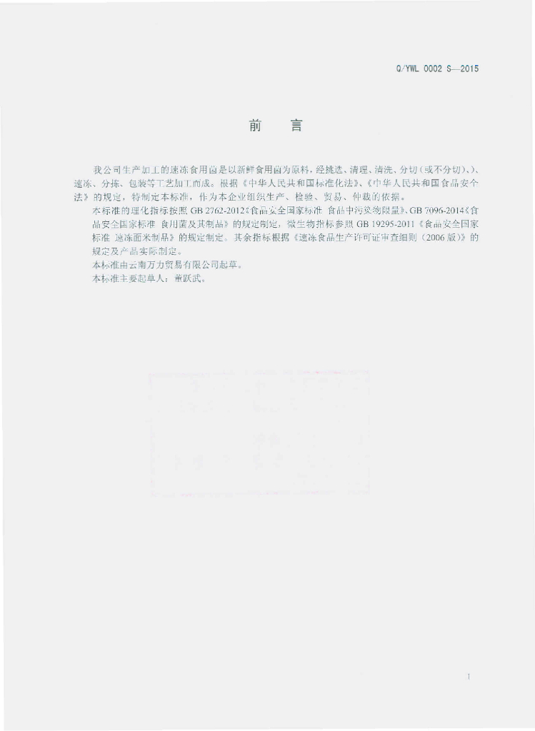 Q/YWL 0002S-2015 云南万力贸易有限公司 速冻食用菌