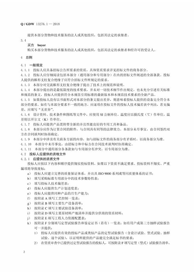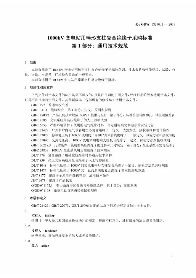 Q/GDW 13276.1-2018 1000kV变电站用棒形支柱复合绝缘子采购标准 第1部分:通用技术规范