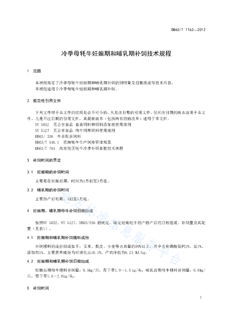 DB63/T 1162-2012 冷季母牦牛妊娠期和哺乳期补饲技术规程