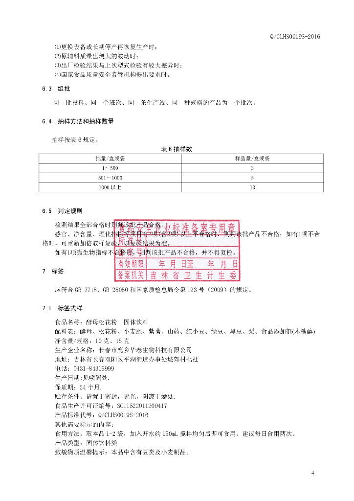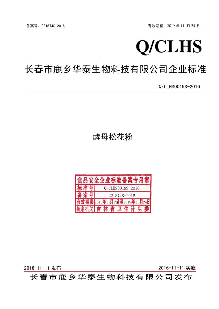 Q/CLHS 0019S-2016 长春市鹿乡华泰生物科技有限公司 酵母松花粉