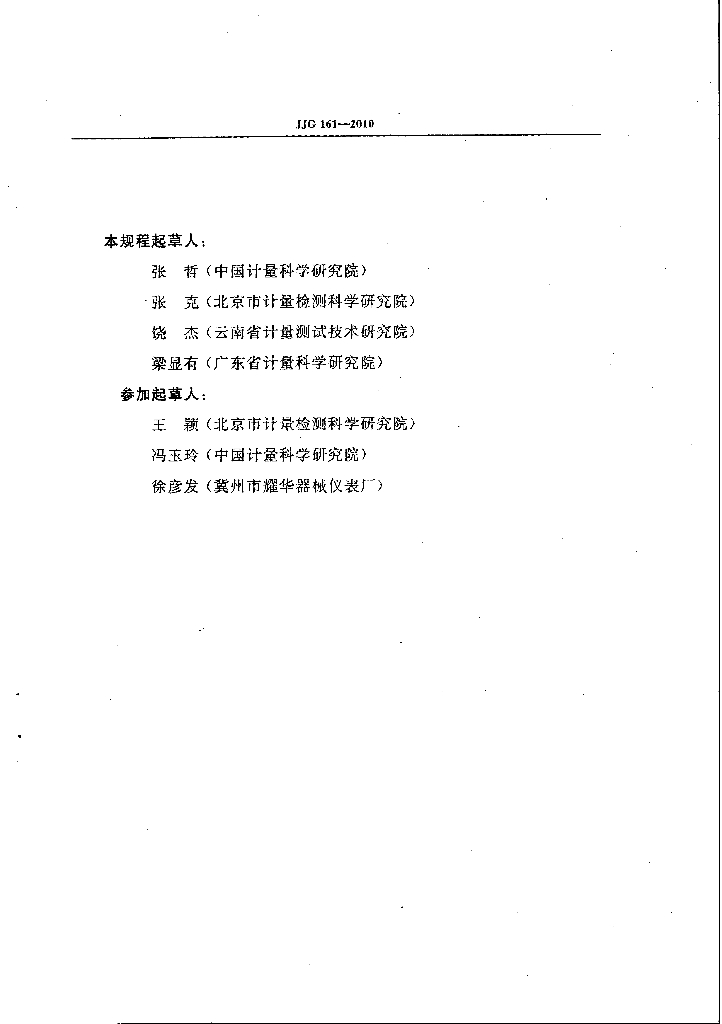 张哲(中国计量科学研究院)、张克(北京市计量检测科学研究院)、饶杰(云南省计量测试技术研究院)、梁显有(广东省计量科学研究院)、王颖(北京市计量检测科学研究院)、冯玉玲(中国计量科学研究院)、徐彦发(冀州市耀华器械仪表厂)