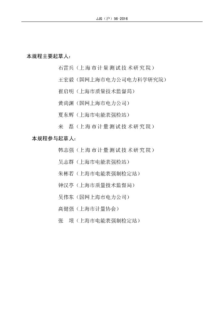 石雷兵(上海市计量测试技术研究院)、王宏毅(国网上海市电力公司电力科学研究院)、崔启明(上海市质量技术监督局)、黄尚渊(国网上海市电力公司)、夏东辉(上海市电能表强检站)、来磊(上海市计量测试技术研究院)、韩志强(上海市计量测试技术研究院)、吴志群(上海市电能表强检站)、朱彬若(上海市电能表强制检定站)、钟汉亭(上海市质量技术监督局)、吴伟东(国网上海市电力公司)、高健强(上海市计量协会)、张垠(上海市电能表强制检定站)