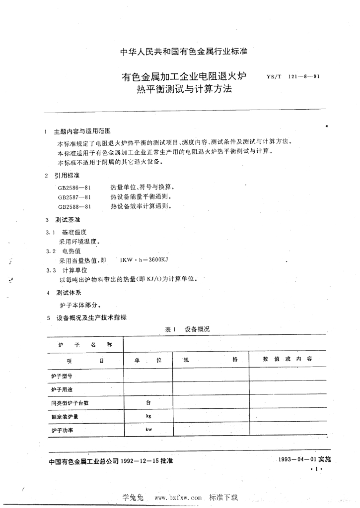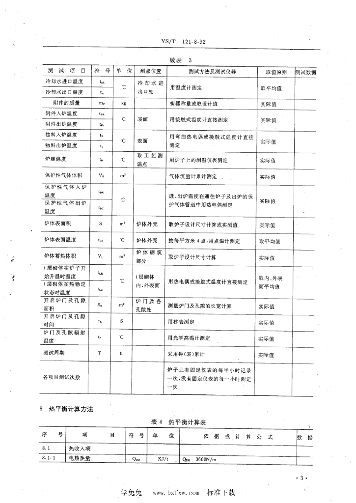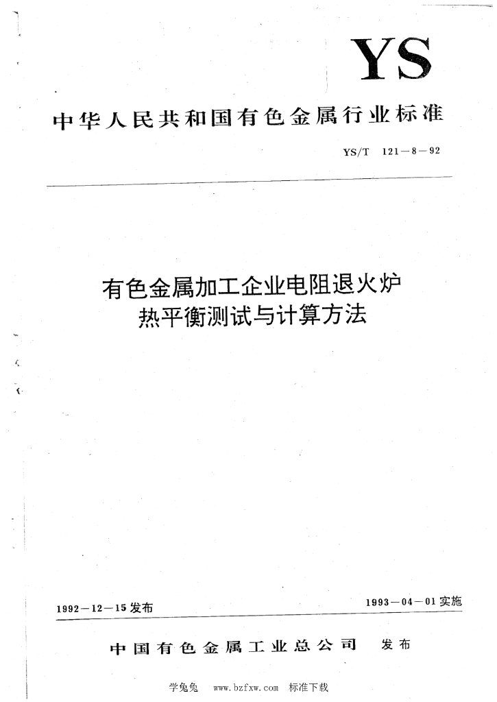 YS/T 121.8-1992 有色金属加工企业电阻退火热平衡测试与计算方法