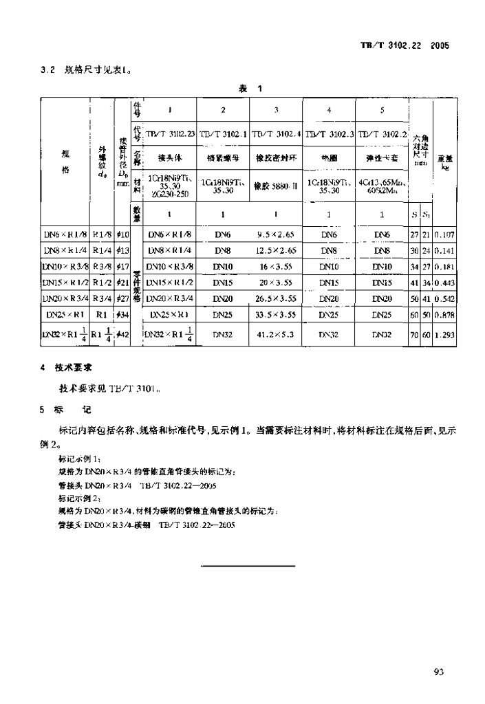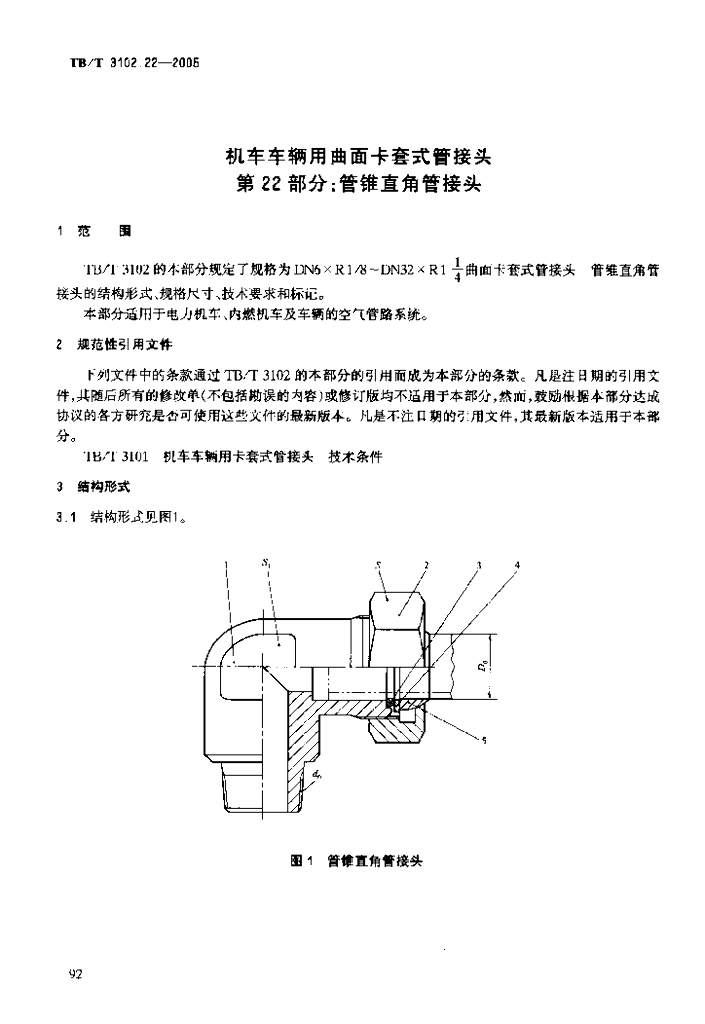 TB/T 3102.22-2005 机车车辆用曲面卡套式管接头 第22部分:管锥直角管接头