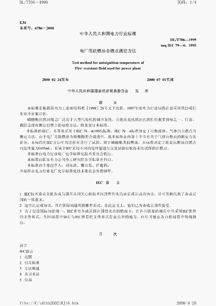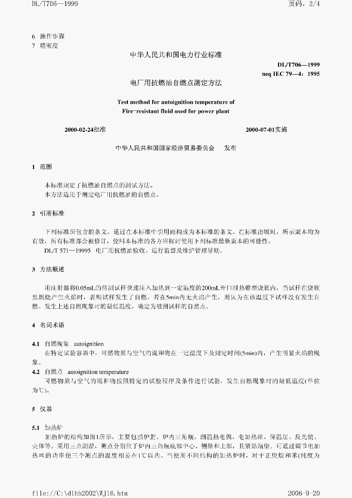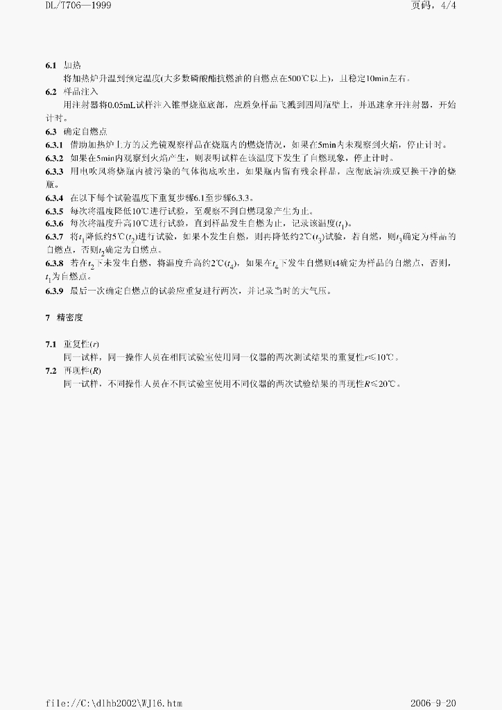 DL/T 706-1999 电厂用抗燃油自燃点测定方法