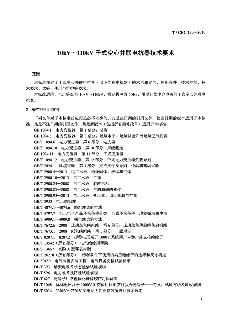 T/CEC 130-2016 10kV~110kV干式空心并联电抗器技术要求