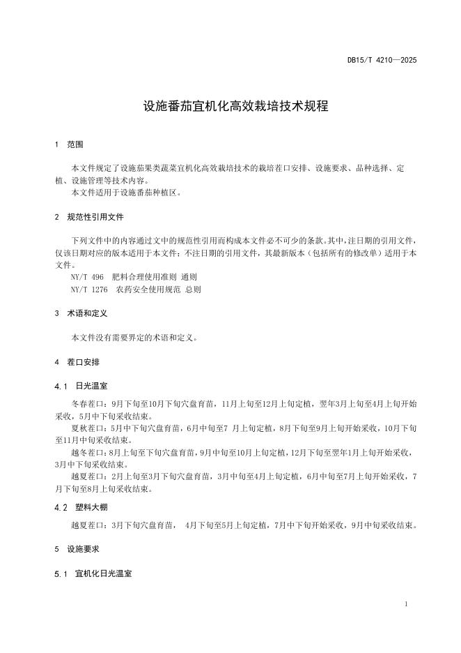 DB15/T 4210-2025 设施番茄宜机化高效栽培技术规程
