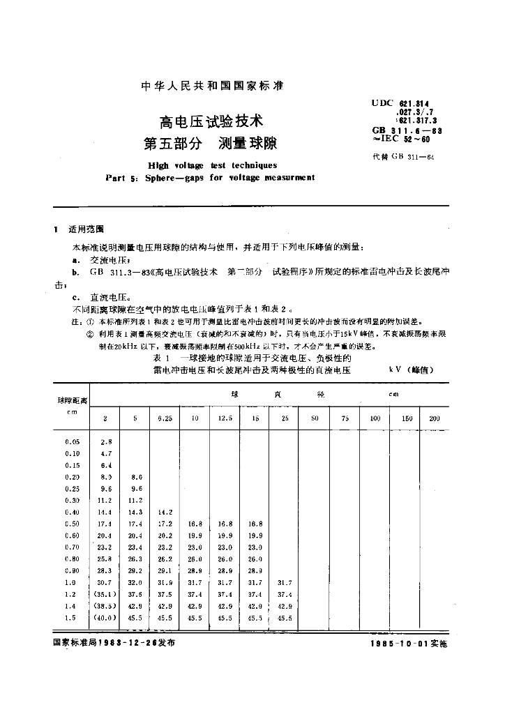 GB/T 311.6-1983 高电压试验技术 第五部分:测量球隙
