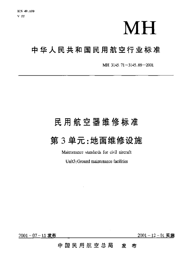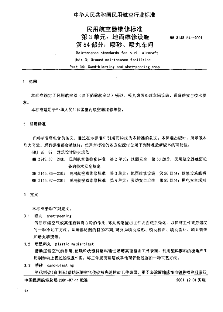 MH 3145.84-2001 民用航空器维修标准 第3单元 地面维修设施 第84部分 喷砂、喷丸车间