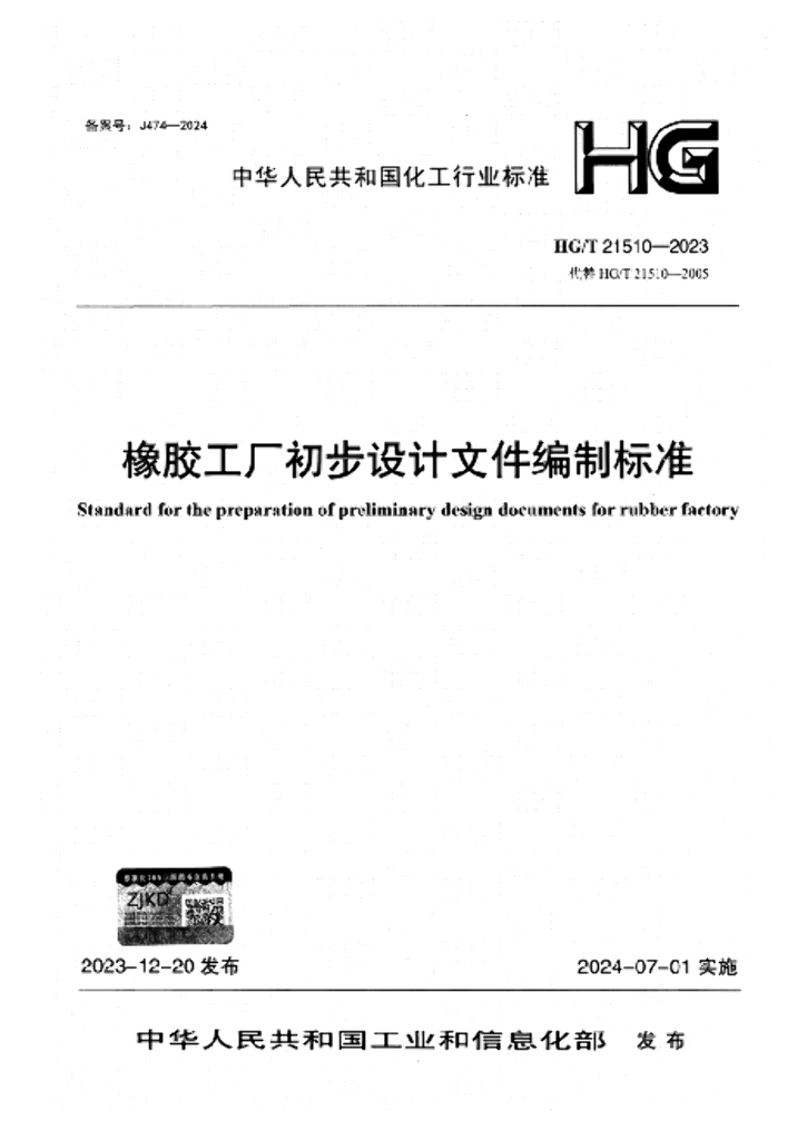 HG/T 21510-2023 橡胶工厂初步设计文件编制标准
