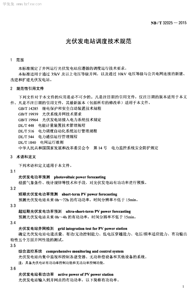 NB/T 32025-2015 光伏发电站调度技术规范