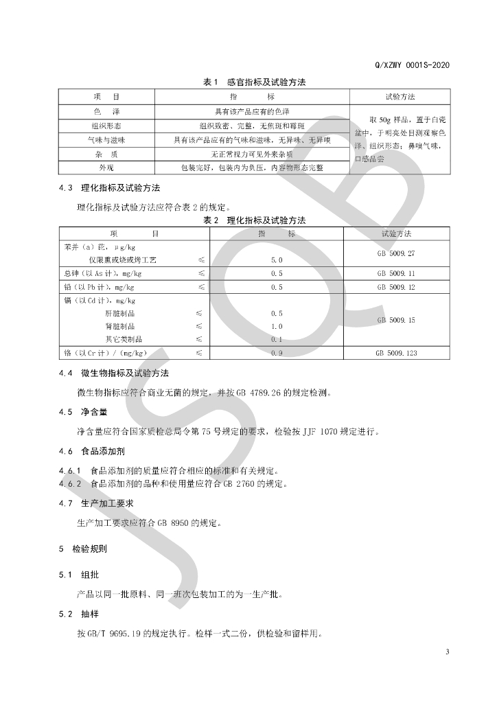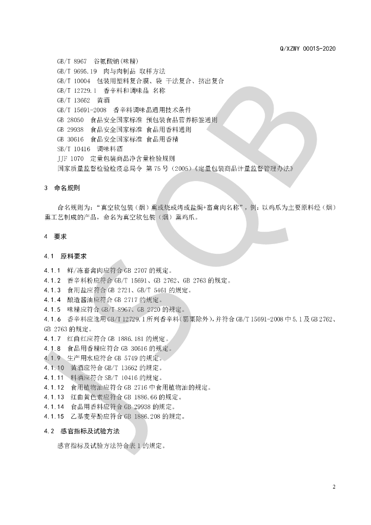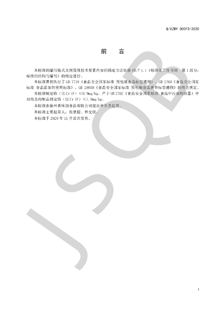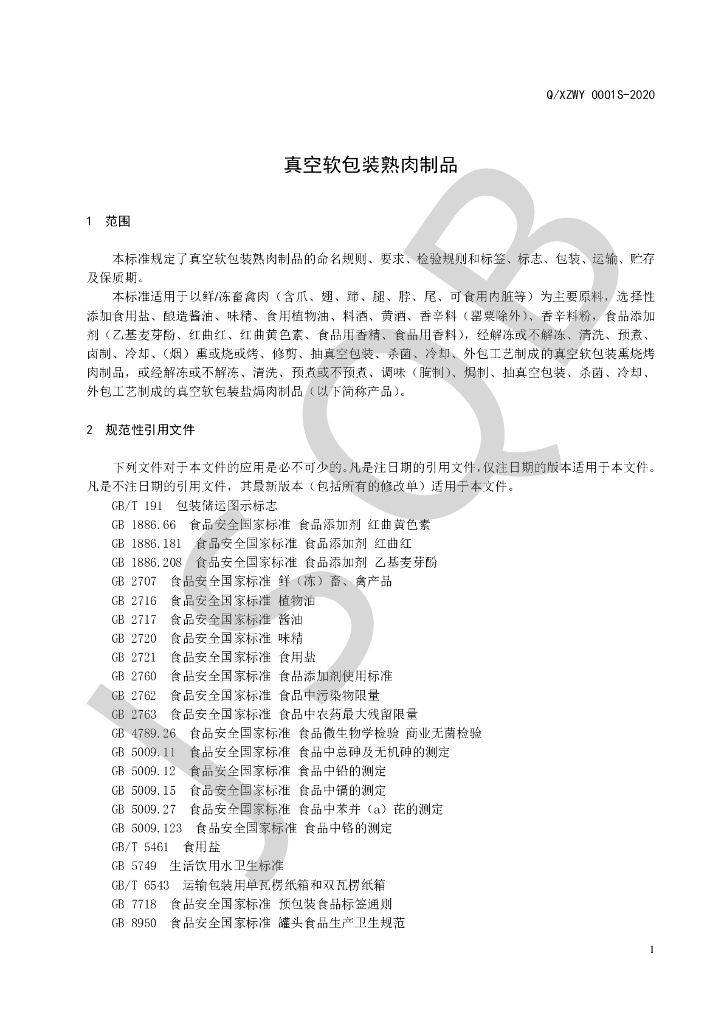 Q/XZWY 0001S-2020 真空软包装熟肉制品