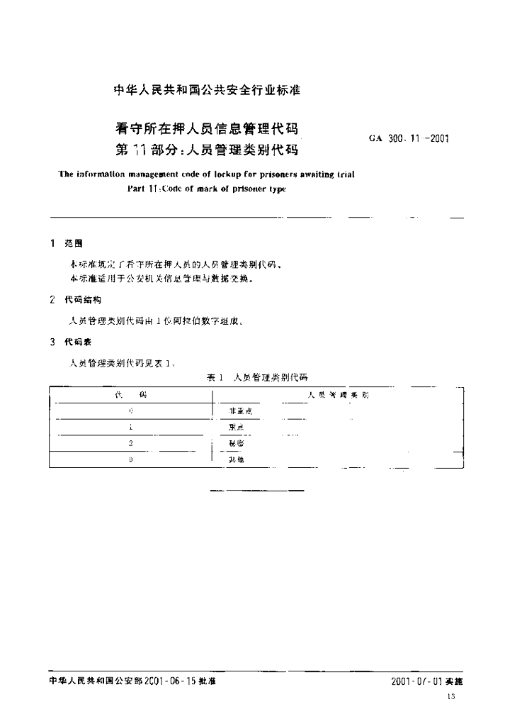 GA 300.11-2001 看守所在押人员信息管理代码 第11部分:人员管理类别代码