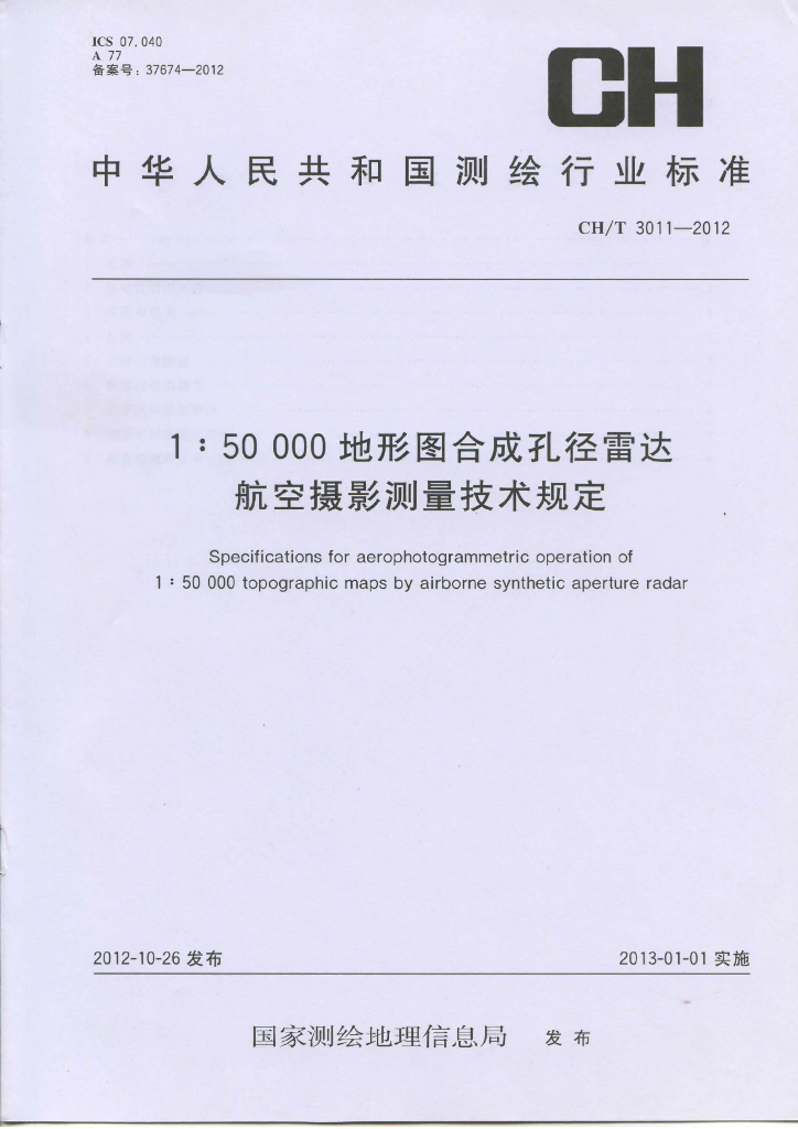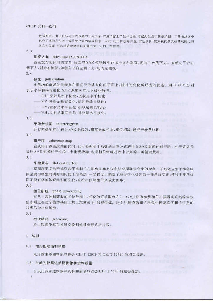 CH/T 3011-2012 1:50 000地形图合成孔径雷达航空摄影测量技术规定