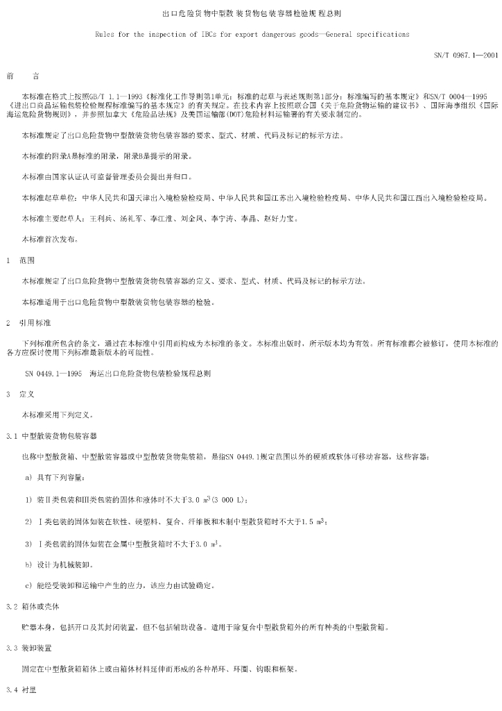SN/T 0987.1-2001 出口危险货物中型散装货物包装容器 检验规程 总则