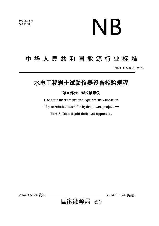 NB/T 11568.8-2024 水电工程岩土试验仪器设备校验规程 第8部分:碟式液限仪