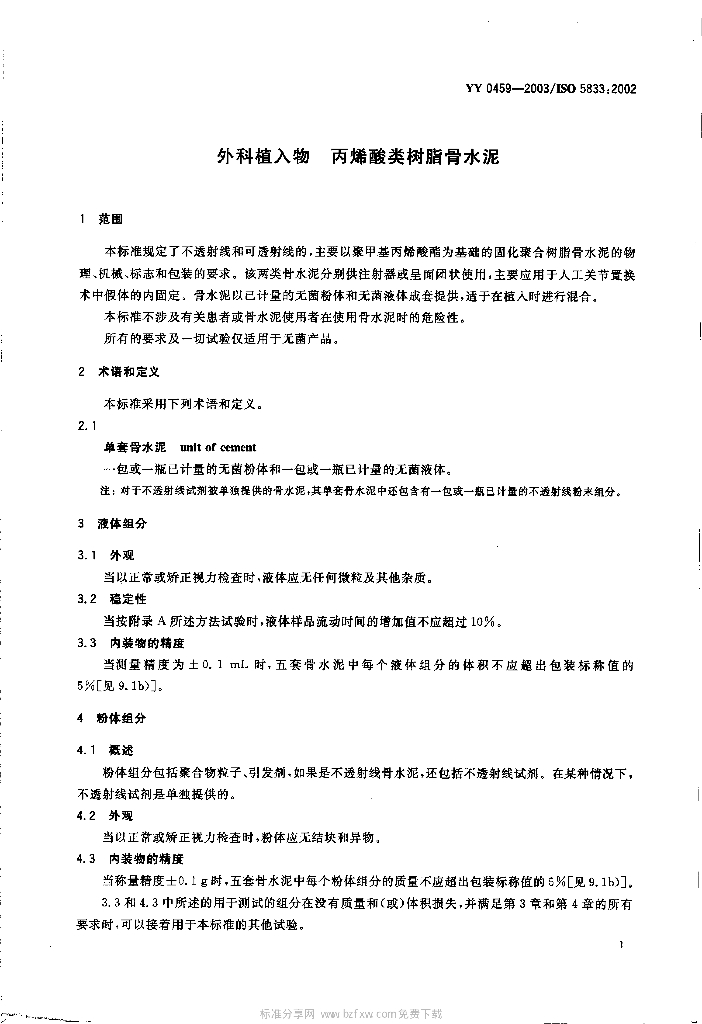 YY 0459-2003/ISO 5833 : 2002 外科植入物丙烯酸类树脂骨水泥