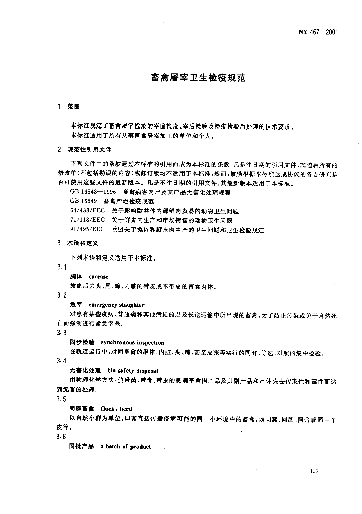 NY 467-2001 畜禽屠宰卫生检疫规范