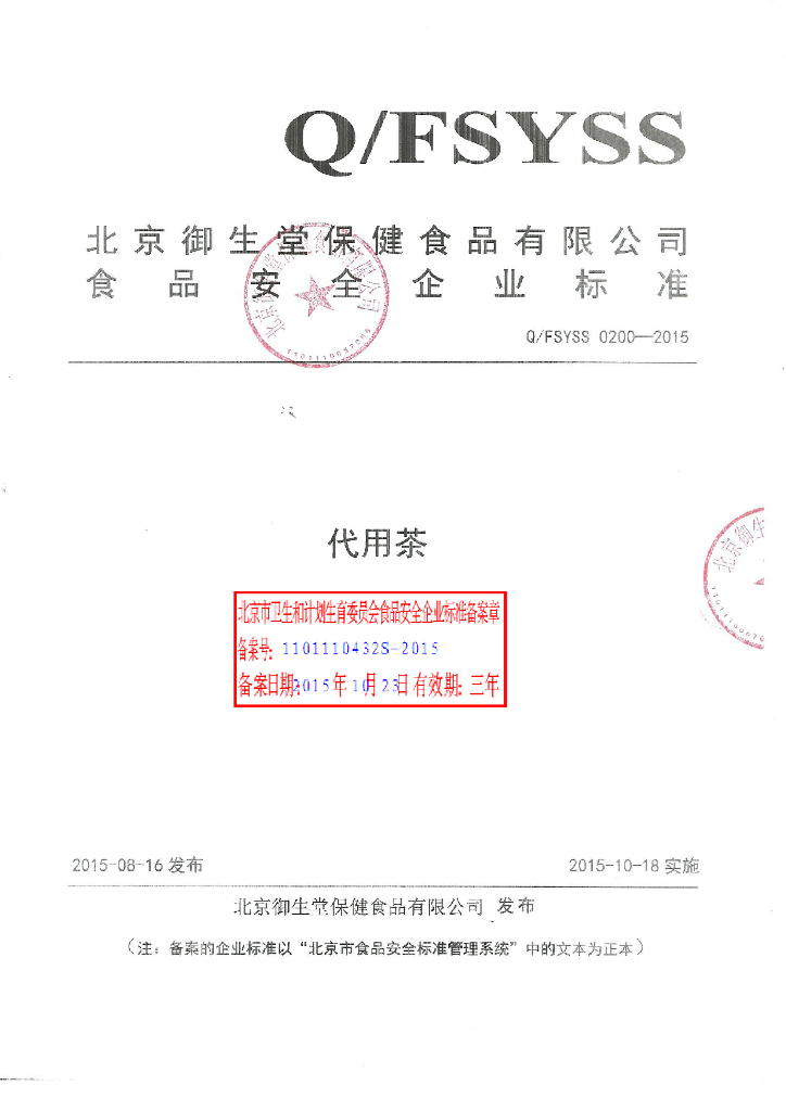 Q/FSYSS 0200-2015 北京御生堂保健食品有限公司 代用茶