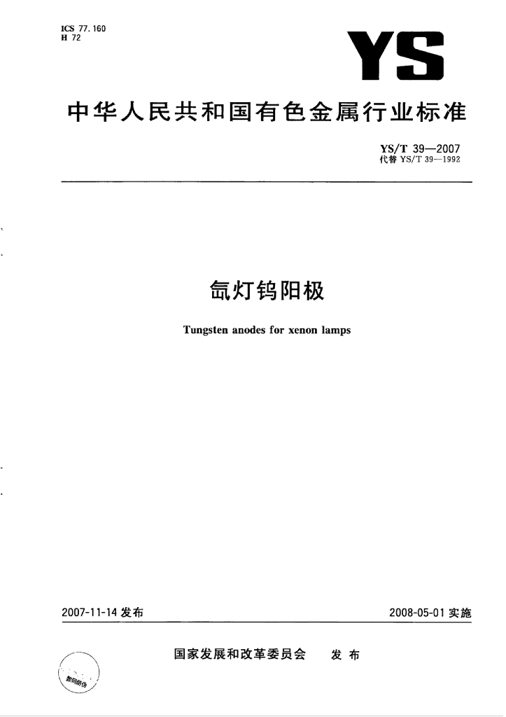 YS/T 39-2007 氙灯钨阳极