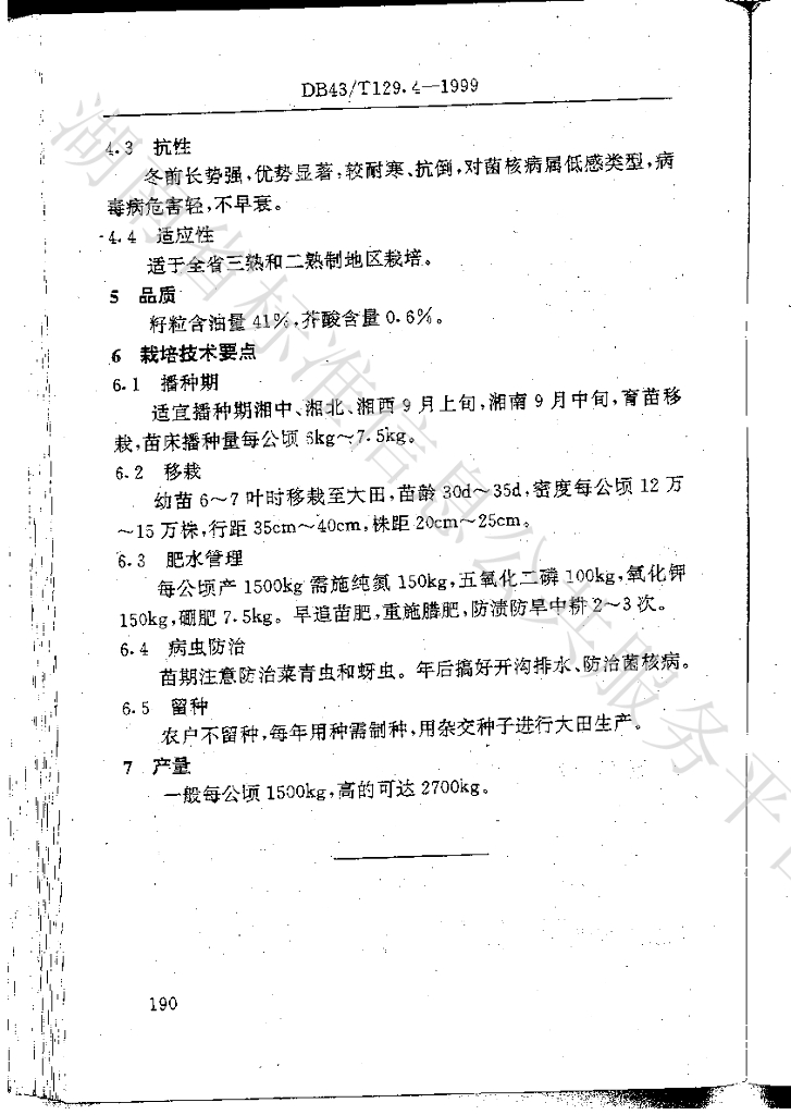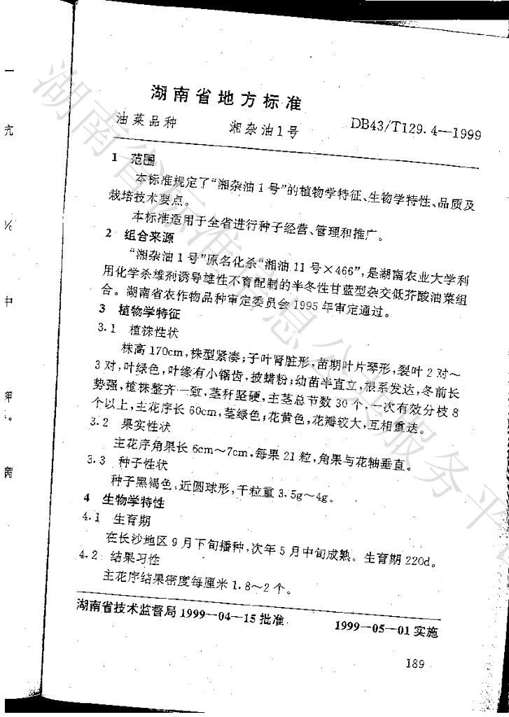 DB43/T 129.4-1999 油菜品种 湘杂油1号