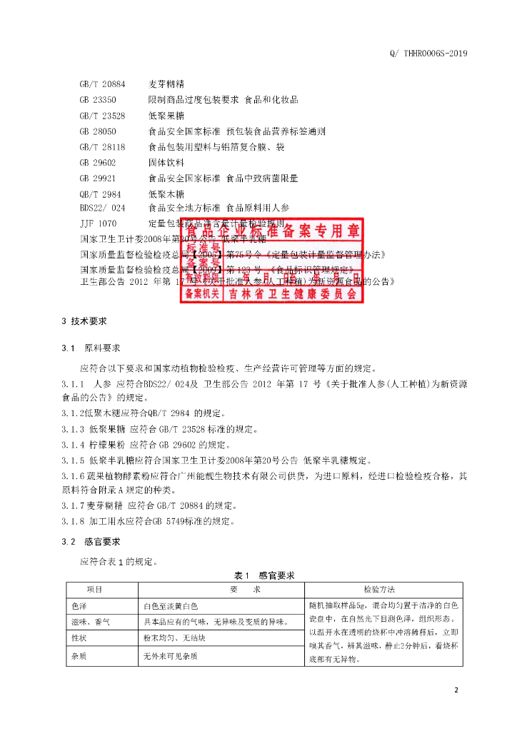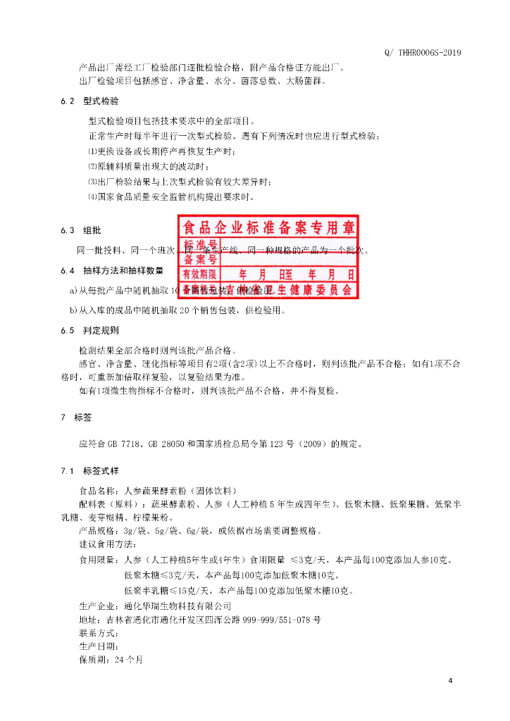 Q/THHR 0006S-2019 人参蔬果酵素粉(固体饮料)