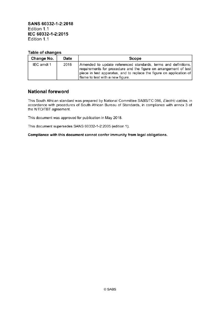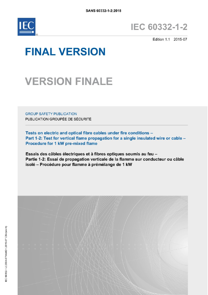 SANS 60332-1-2:2018 电缆和光缆在火焰条件下的燃烧试验 第1-2部分:单根绝缘电线或电缆的垂直燃烧试验-1kW预混合火焰试验程序