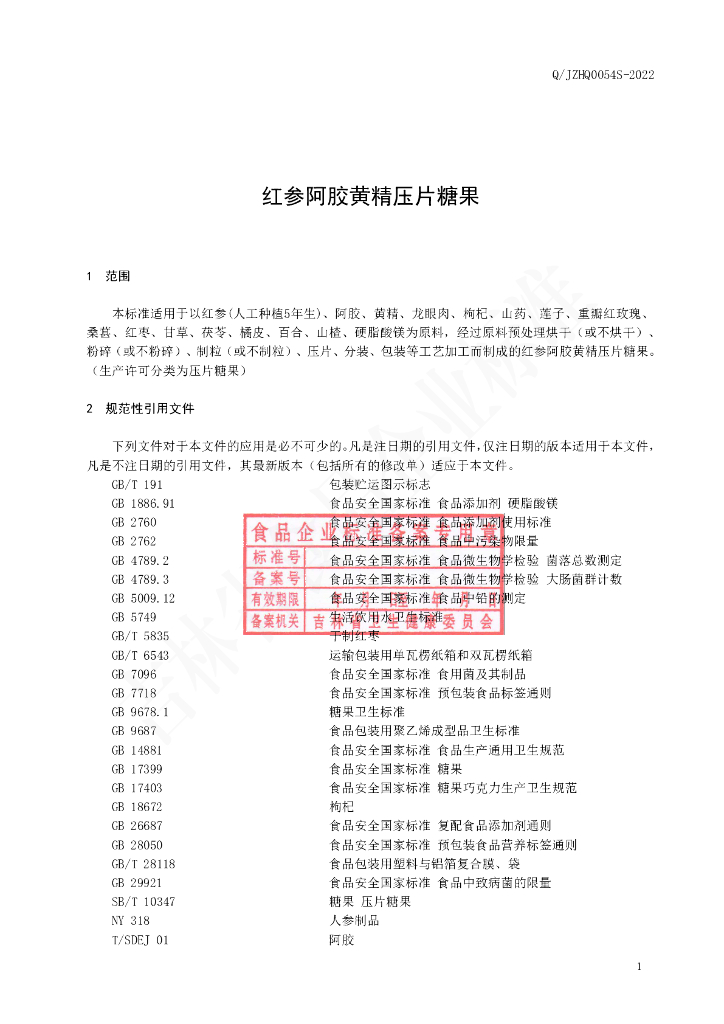 Q/JZHQ 0054S-2022 红参阿胶黄精压片糖果