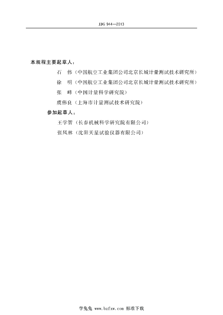 石伟(中国航空工业集团公司北京长城计量测试技术研究所)、徐明(中国航空工业集团公司北京长城计量测试技术研究所)、张峰(中国计量科学研究院)、虞伟良(上海市计量测试技术研究院)、王学智(长春机械科学研究院有限公司)、张凤林(沈阳天星试验仪器有限公司)