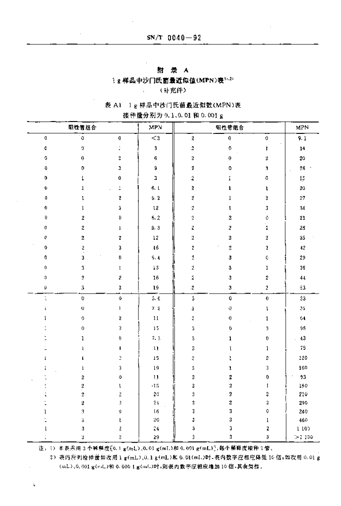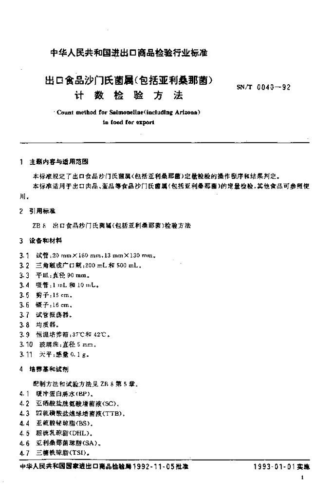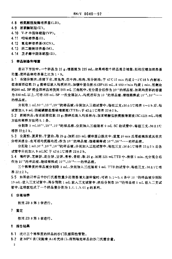 SN/T 0040-1992 出口食品沙门氏菌属(包括亚利桑那菌)计数检验方法