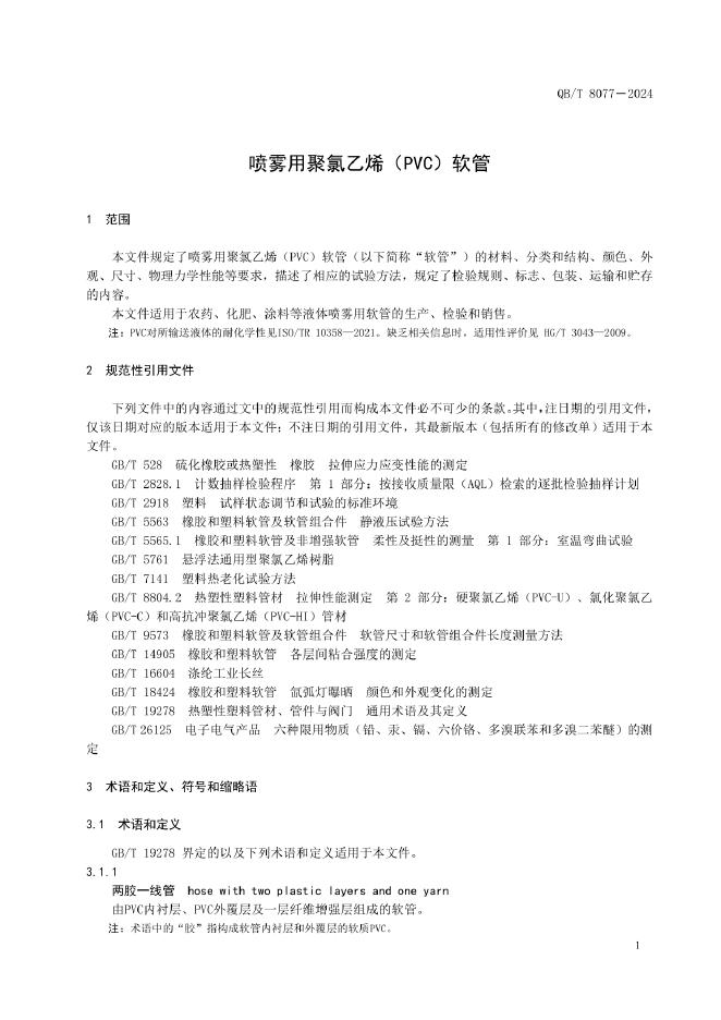 QB/T 8077-2024 喷雾用聚氯乙烯(PVC)软管