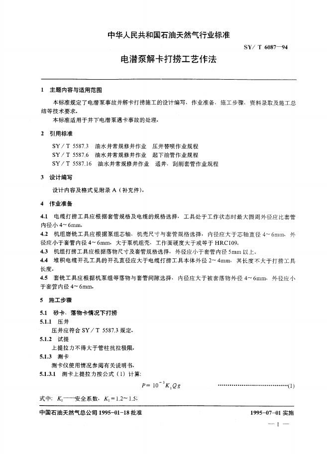 SY/T 6087-1994 电潜泵解卡打捞工艺作法