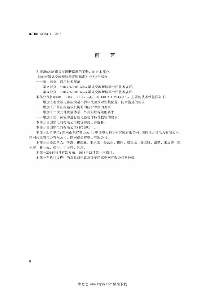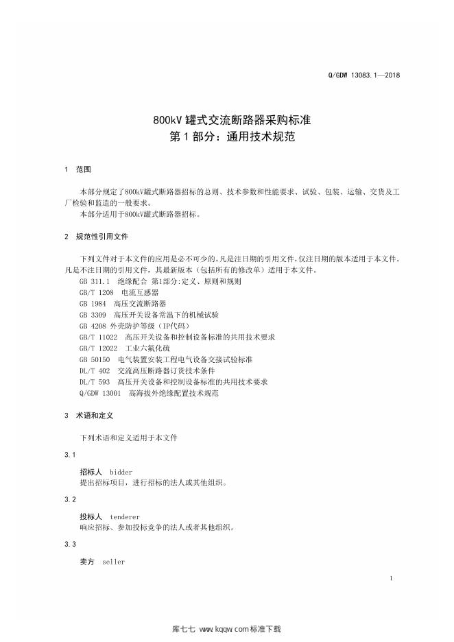 Q/GDW 13083.1-2018 800kV罐式交流断路器采购标准 第1部分:通用技术规范