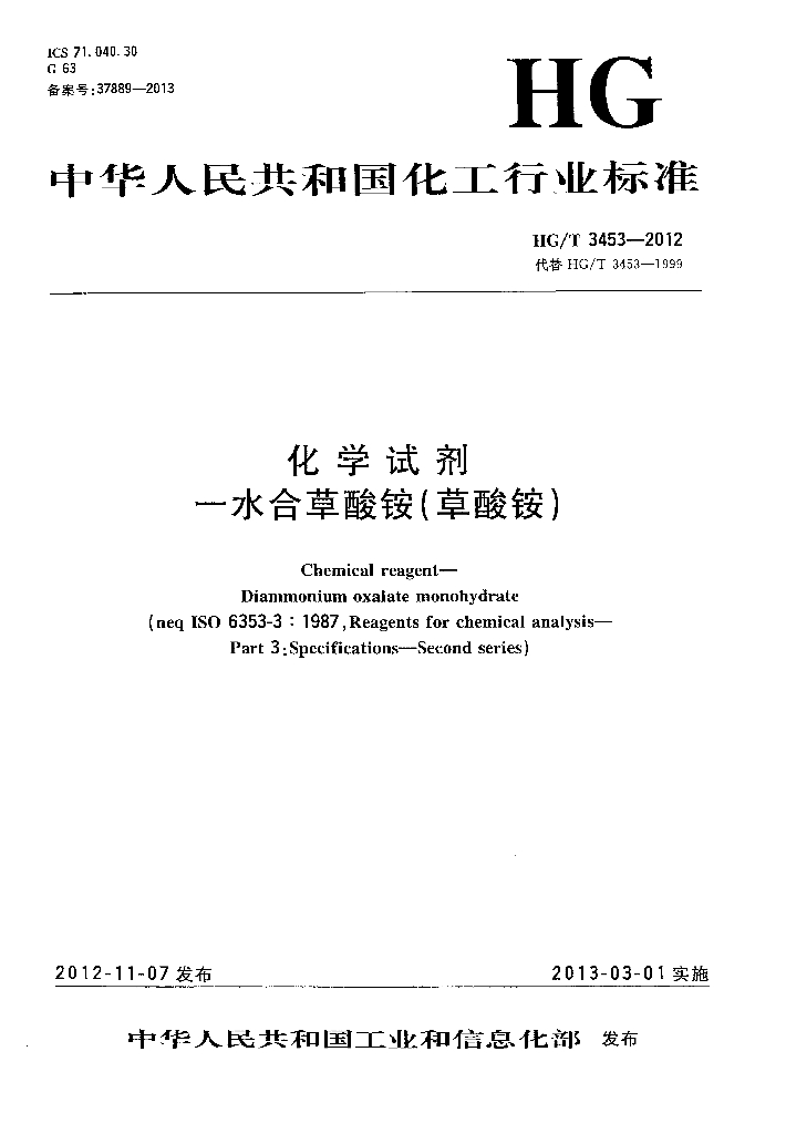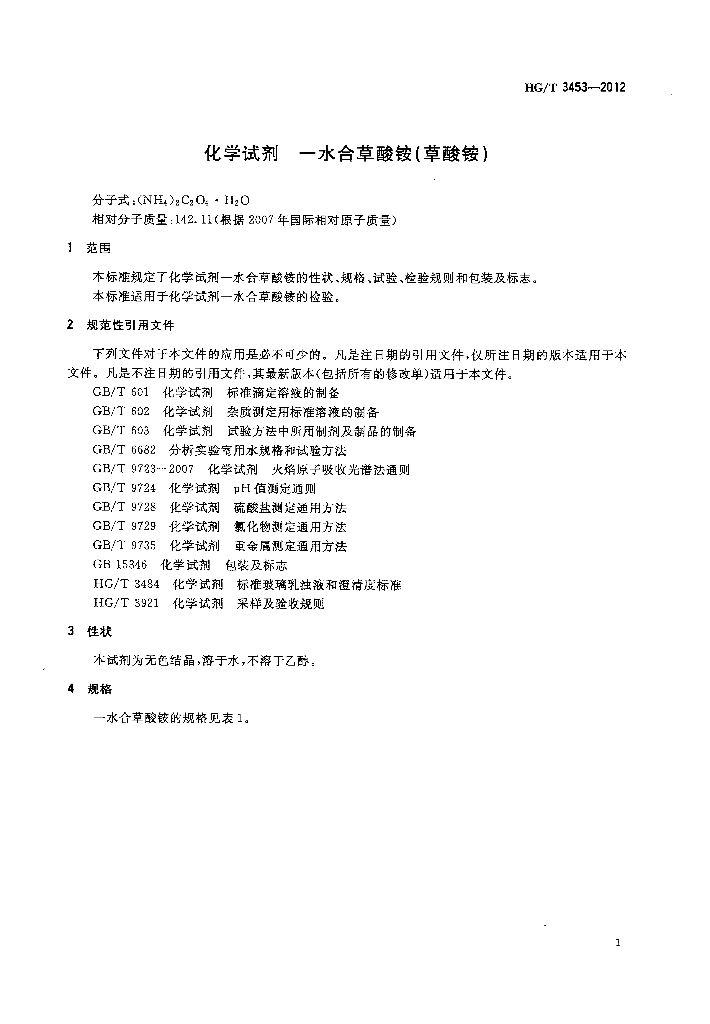 HG/T 3453-2012 代替 HG/T 3453-1999 化学试剂 一水合草酸铵(草酸铵)