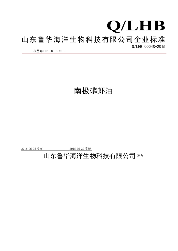 Q/LHB 0004S-2015 山东鲁华海洋生物科技有限公司 南极磷虾油