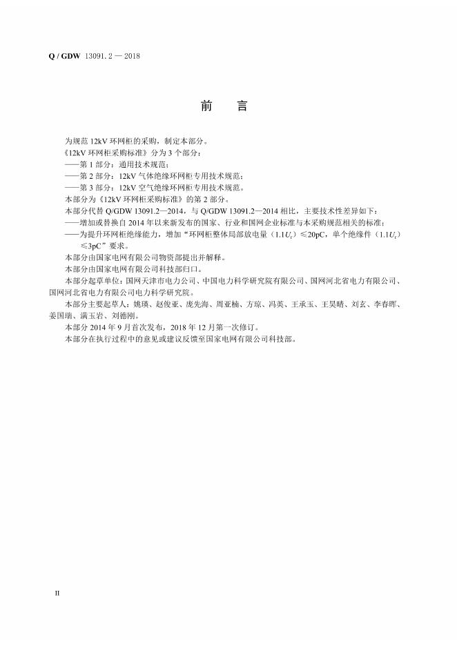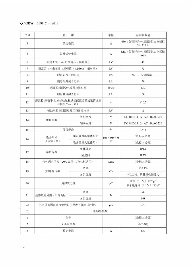 Q/GDW 13091.2-2018 12kV环网柜采购标准 第2部分:12kV气体绝缘环网柜专用技术规范