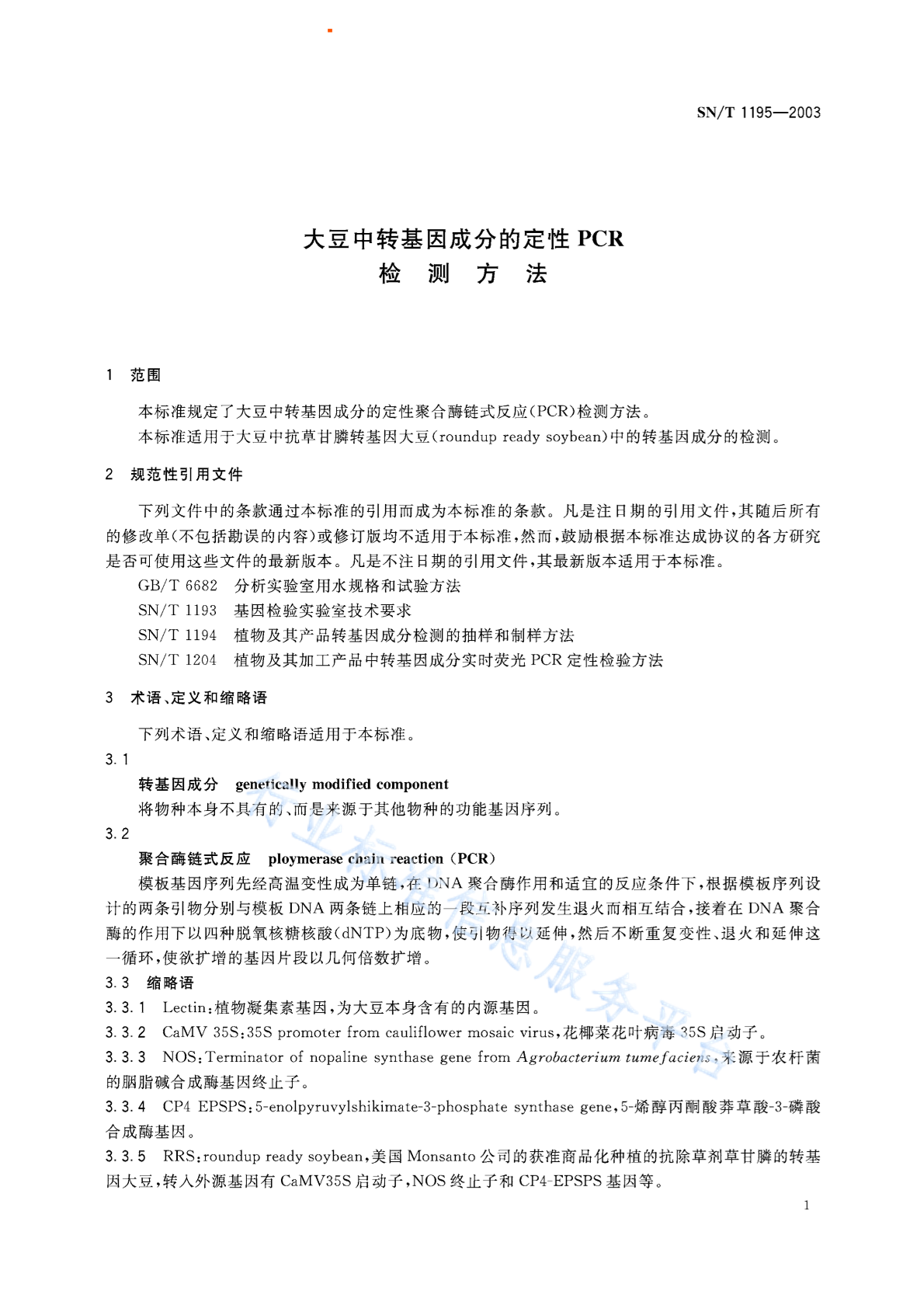 SN/T 1195-2003 大豆中转基因成分定性PCR检测方法