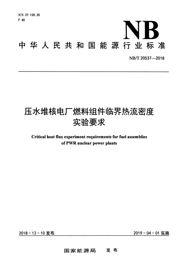 NB/T 20537-2018 压水堆核电厂燃料组件临界热流密度实验要求