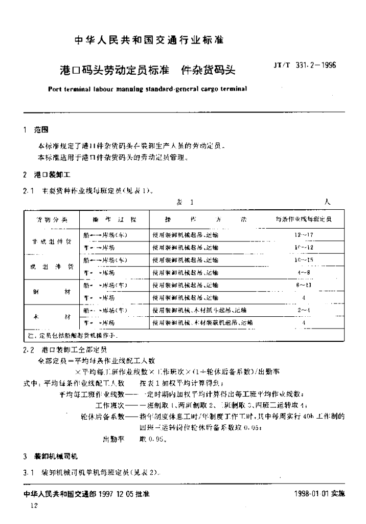 JT/T 331.2-1996 港口码头劳动定员标准件杂货码头