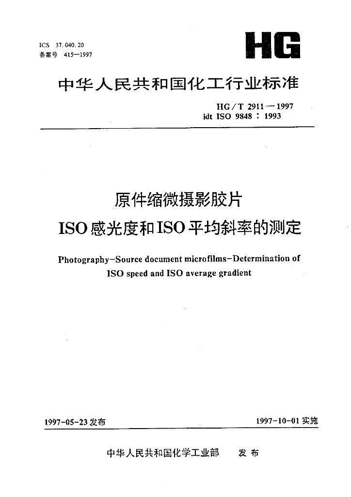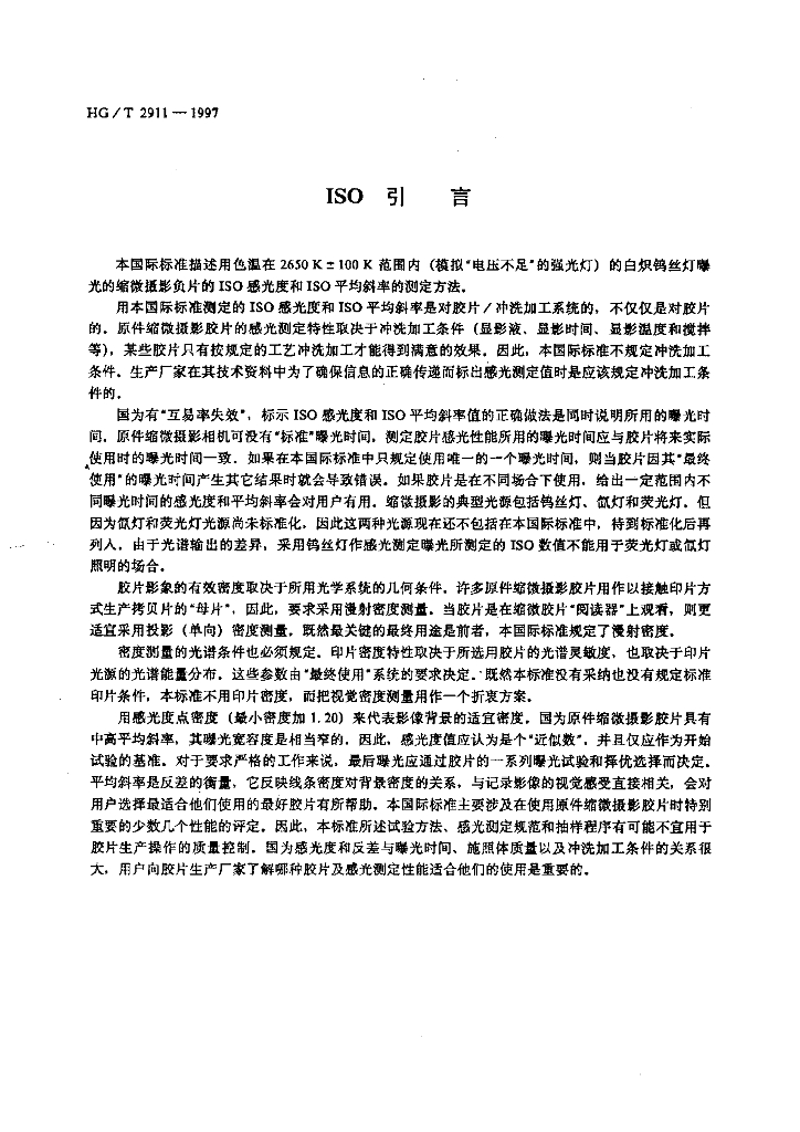 HG/T 2911-1997 原件缩微摄影胶片 ISO感光度和ISO平均斜率的测定